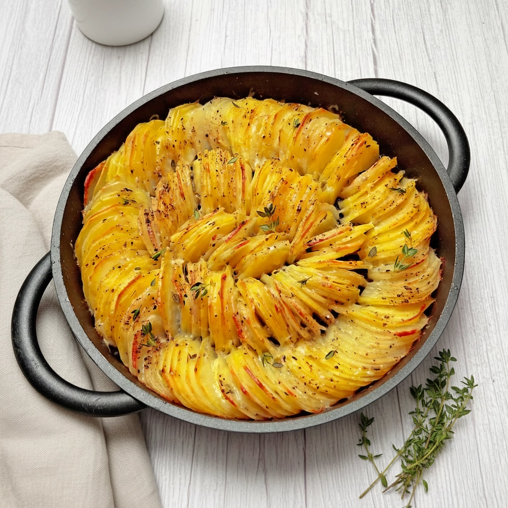 Crispy Garlic & Thyme Boulangere Potatoes Thinly sliced potatoes baked in a fragrant garlic and herb stock for a golden, crisp finish. The Side Dish