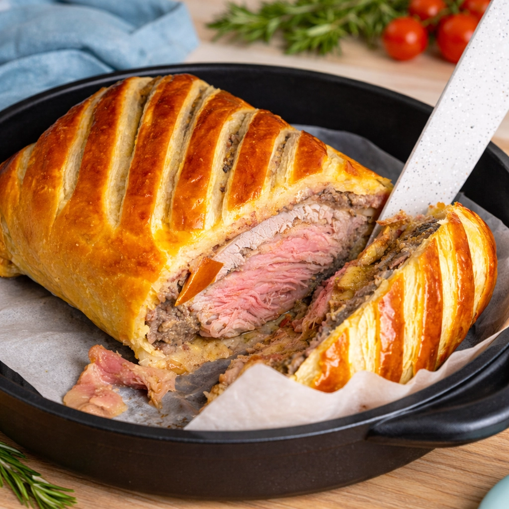Beef Wellington Juicy beef coated in a delicious mushroom paste, wrapped in ham and baked in a pastry. The Showstopper – Beef Wellington A timeless